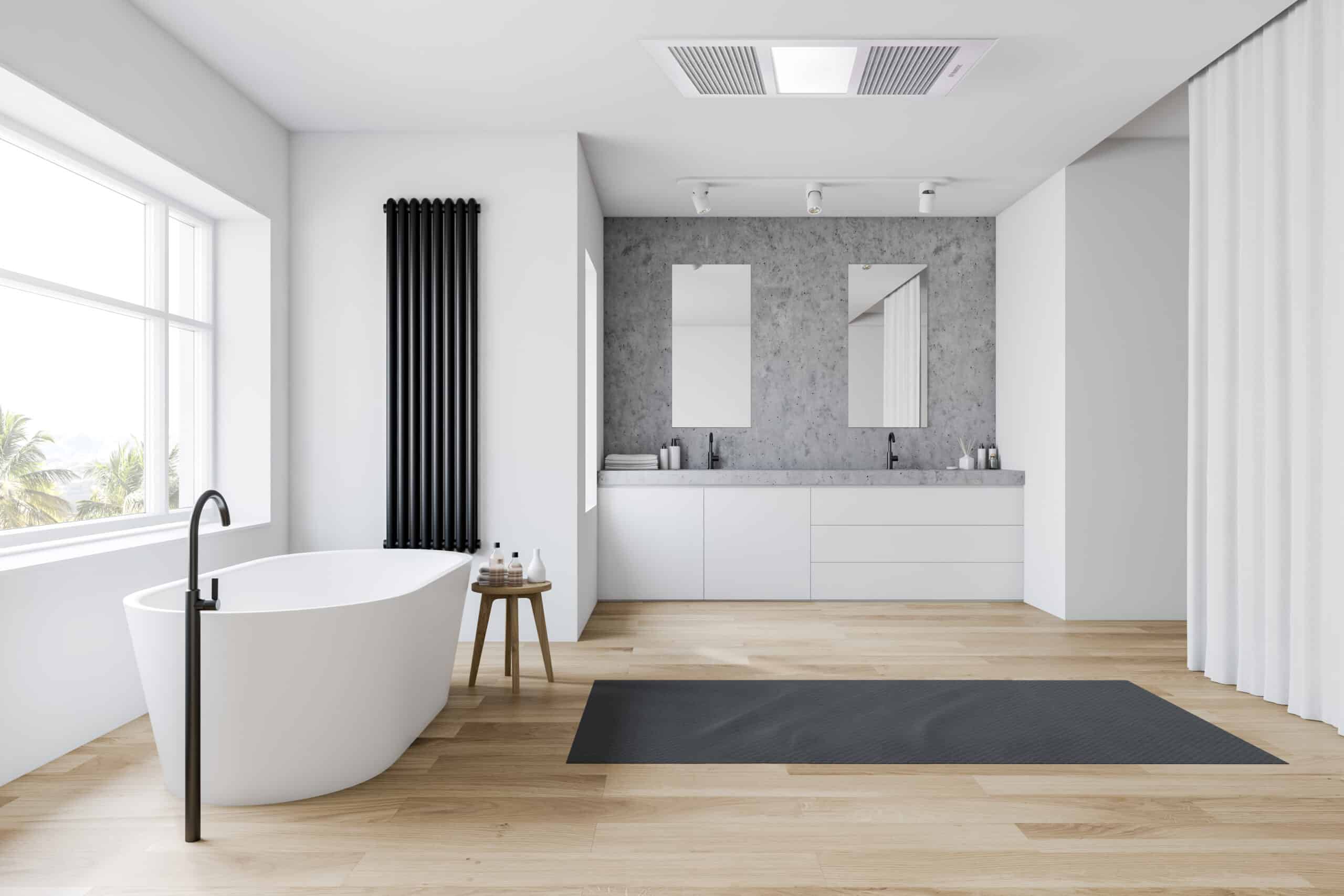 Side view of comfortable bathroom with white and stone walls, wooden floor, white bathtub and double sink on white countertop with vertical mirrors. 3d rendering